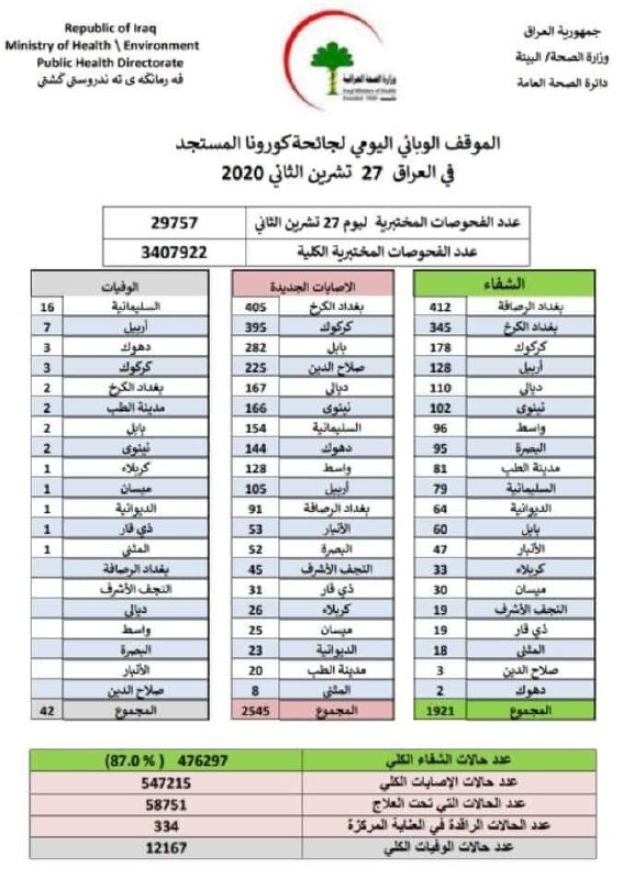اعلنت وزارة الصحة، الجمعة، تماثل ١٩٢١ مصاب بكورونا الى الشفاء، فيما سجل عموم لعراق ٤٢ حالة وفاة جديدة و٢٥٤٥ اصابة جديدة بالفيروس.