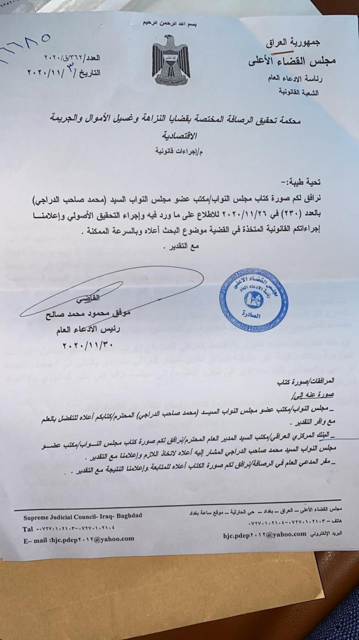 وبحسب الوثيقة، فأنّ رئاسة الادعاء العام طلبت من المحكمة المختصة بقضايا النزاهة وغسيل الأموال الإطلاع على ما ورد من مآخذ نيابية حول نافذة بيع العملة التي يصدرها البنك المركزي العراقي، وإجراء تحقيق أصولي وفي أسرع وقت ممكن.