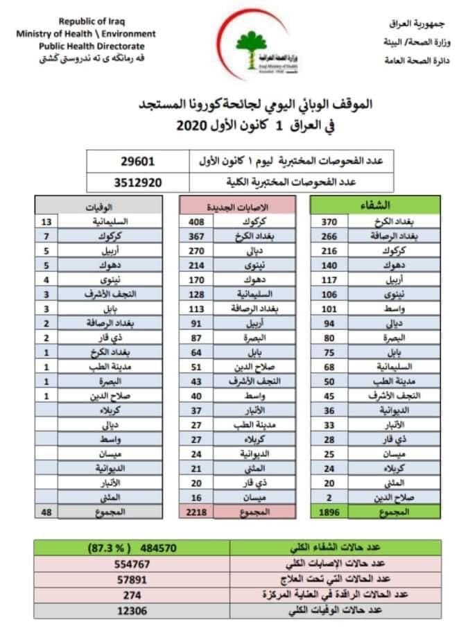 نشرت وزارة الصحة، الثلاثاء، جدولاً بتفاصيل الموقف الوبائي اليومي لجائحة كورونا المستجد في العراق، حيث أظهر الجدول تسجيل 2218 إصابة جديدة بالفيروس التاجي.