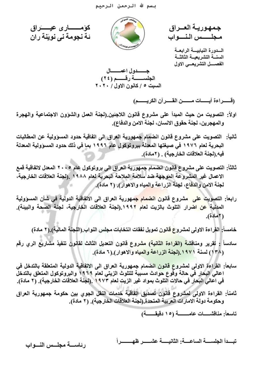 نشرت الدائرة الإعلامية لمجلس النواب، الخميس، جدول أعمال الجلسة الاعتيادية الـ24 المقرر عقدها يوم السبت المقبل.