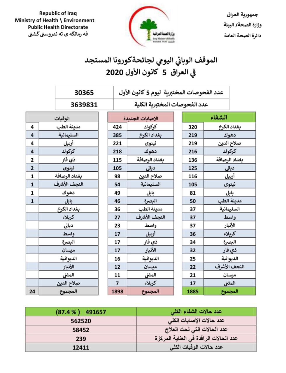 اعلنت وزارة الصحة، السبت، عن الموقف الوبائي اليومي لجائحة كورونا في العراق لليوم.