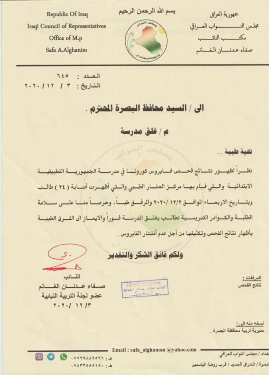 وخاطب عضو اللجنة صفاء الغانم العيداني في وثيقة أنه "نظرا لظهور نتائج فحص فيروس كورونا في مدرسة الجمهورية التطبيقية الابتدائية والتي قام بها مركز العشار الطبي والتي أظهرت إصابة 24 طالبا، نطالب بغلق المدرسة فوراً".