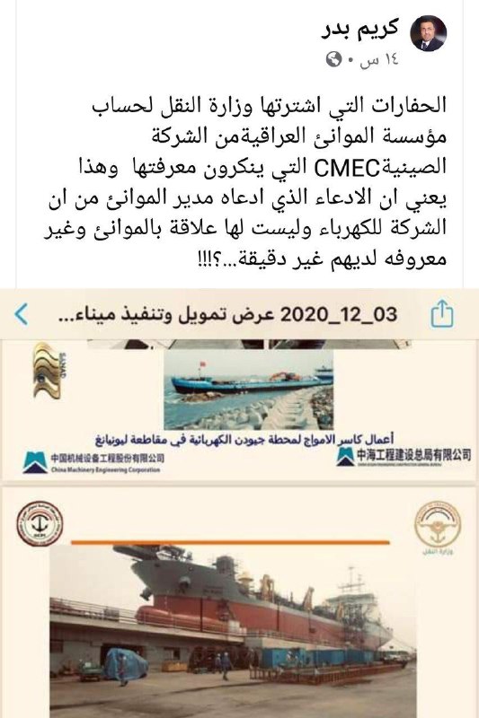 ونشر بدر في حسابه على الفيسبوك صورة للحفارات التي اشترتها وزارة النقل لحساب مؤسسة الموانيء العراقية من الشركة الصينية CMEC التي ينكرون معرفتها