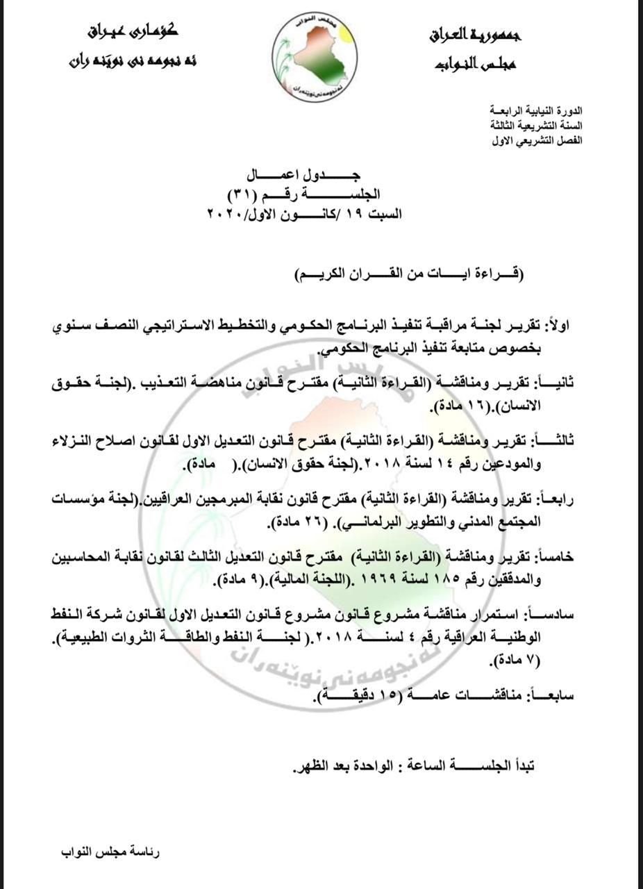 نشرت الدائرة الإعلامية لمجلس النواب، الجمعة، جدول أعمال الجلسة الاعتيادية الـ31 من الفصل التشريعي الحالي المقرر عقدها غداً السبت.