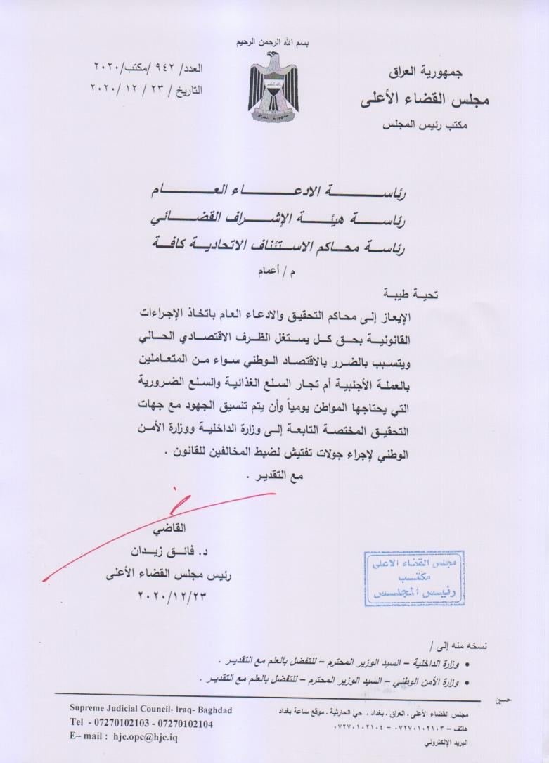 وقال إعلام مجلس القضاء في بيان، إن "مجلس القضاء الاعلى وجه بإعمام صادر عنه كافة محاكم التحقيق باتخاذ الاجراءات القانونية بحق كل من تسبب بالضرر بالاقتصاد الوطني سواء من تجار العملة الاجنبية ام التجار المحتكرين للبضائع والسلع الغذائية والسلع الضرورية التي يحتاجها المواطنين يوميا".