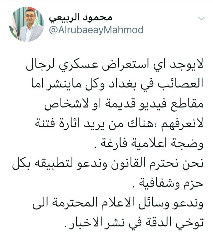 وقال الربيعي في تغريدة له على تويتر اطلعت عليها وكالة انباء براثا (( لا يوجد اي استعراض عسكري لرجال العصائب في بغداد