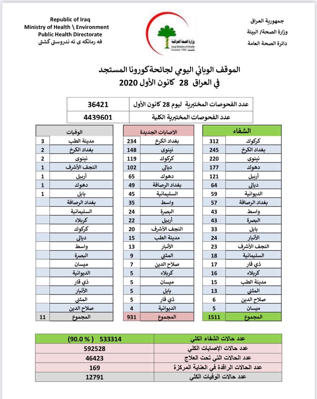 كما تماثل 1511 حالة للشفاء من كورونا. وتم تسجيل 11 حالة وفاة جديدة بكورونا في عموم العراق