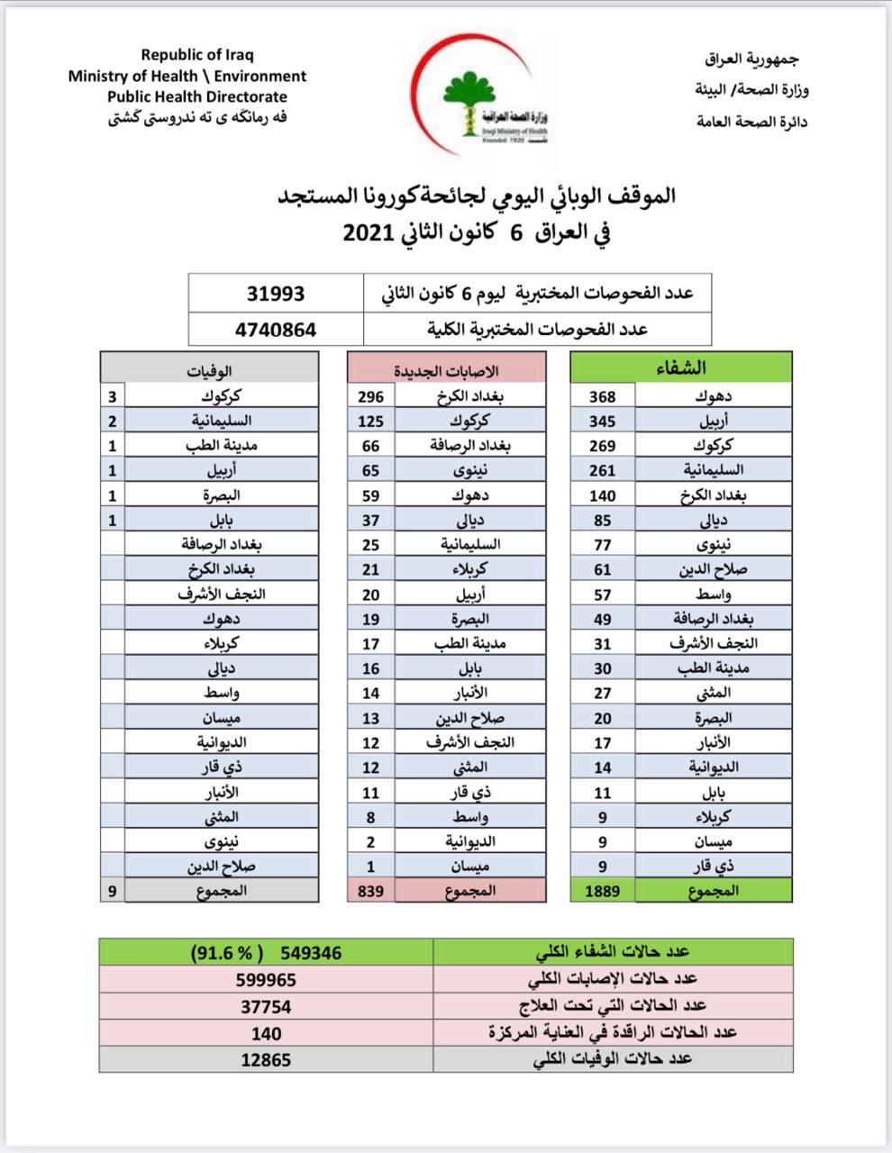 وذكرت الوزارة في بيان ، أنه "تم تسجيل 1889 حالة شفاء من الوباء، فضلاً عن 839 إصابة، بالإضافة إلى تسع حالات وفيات".