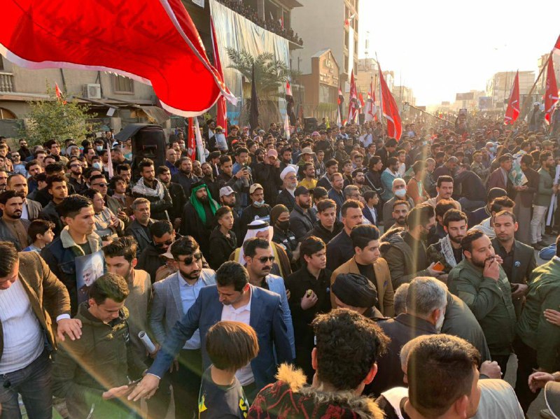 البصرة تستذكر شهادة ابنها البار ابو مهدي المهندس والشهيد الضيف سليماني، بحضور تجاوز ال نصف مليون شخص بالمحافظة الان .