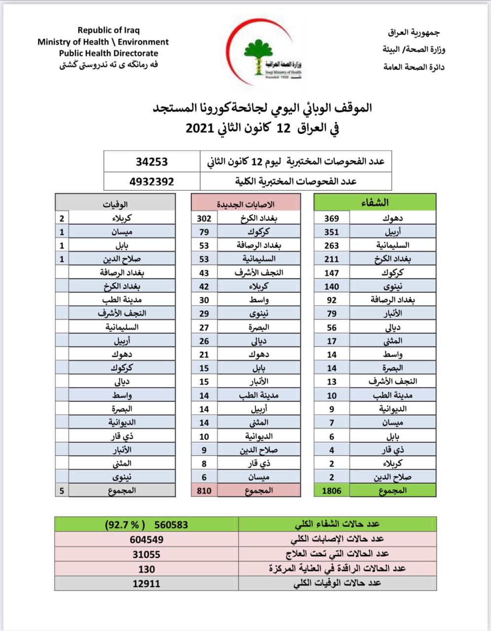 اعلنت وزارة الصحة، الثلاثاء، عن الموقف الوبائي اليومي لجائحة كورونا في العراق لليوم.