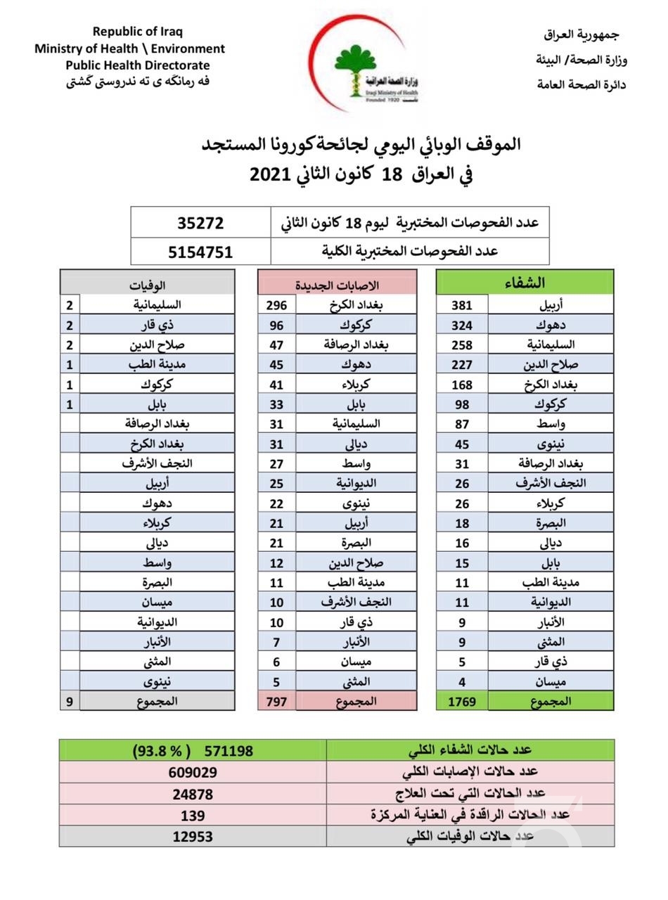 ومنذ تفشي الجائحة في العراق، في 24 شباط 2020، حتى اليوم، بلغ عدد الإصابات الكلي 609029، وعدد الوفيات الكلي 12953.