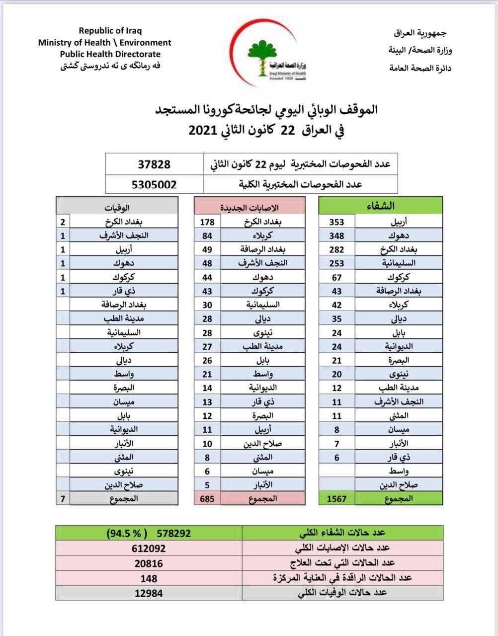 أعلنت وزارة الصحة العراقية اليوم الجمعة، عن الموقف الوبائي لجائحة كورونا في العراق.