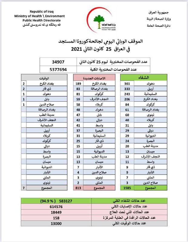 وذكرت الوزارة في بيان أنه "تم تسجيل 1585حالة شفاء من فيروس كورونا خلال 24 ساعة الماضية، فضلاً عن 813 إصابة، بالإضافة إلى 7 حالات وفيات".