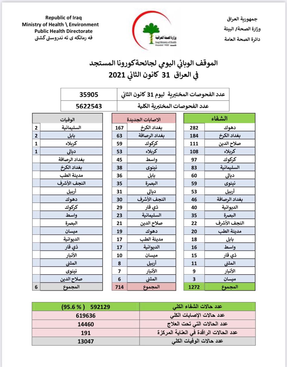 اعلنت وزارة الصحة والبيئة عن الموقف الوبائي الخاص بفيروس كورونا لليوم الاحد.
