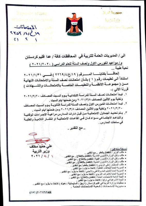 واضافت أن "الامتحان كان من المقرر إجراءهُ يوم السبت الموافق الـ6 من شهر شباط ، حيث تم تأجيلهُ مراعاةً لظروف الطلبة ولتهيئة الأجواء المناسبة لهم الي يوم السبت المصادف الـ20 من الشهر ذاته لعام 2021".