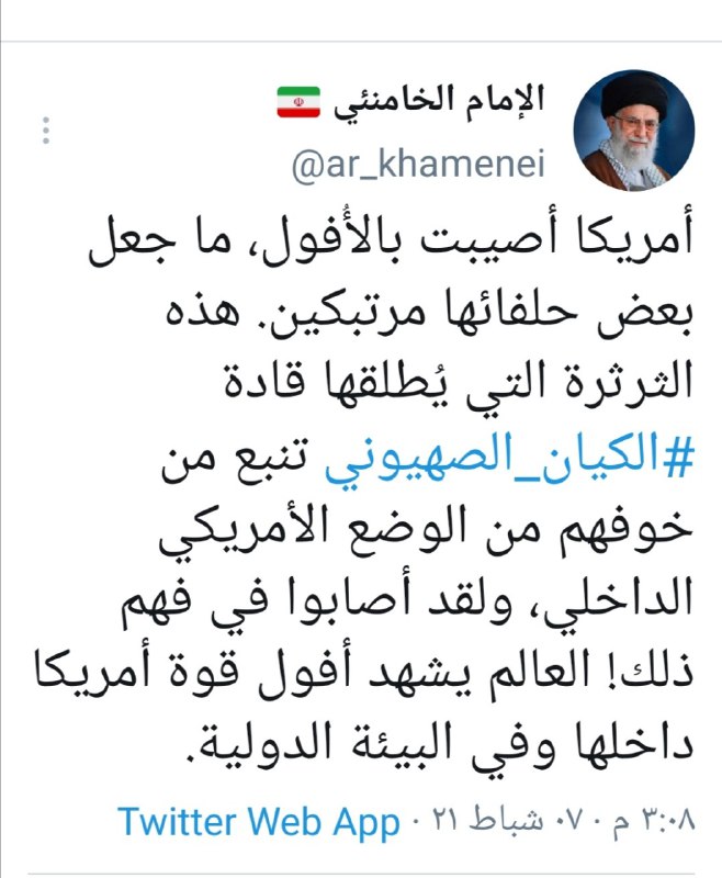 واضاف سماحته في تغريدة اخرى ان امريكا قد اصيبت بالافول ما جعل بعض حلفائها مرتبكين مشيرا الى ان هذه الثرثرة التي يطلقها قادة الكيان الصهيوني تنبع من خوفهم من الوضع الامريكي الداخلي ولقد اصابوا في فهم ذلك