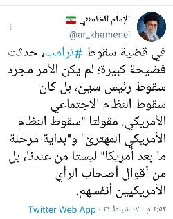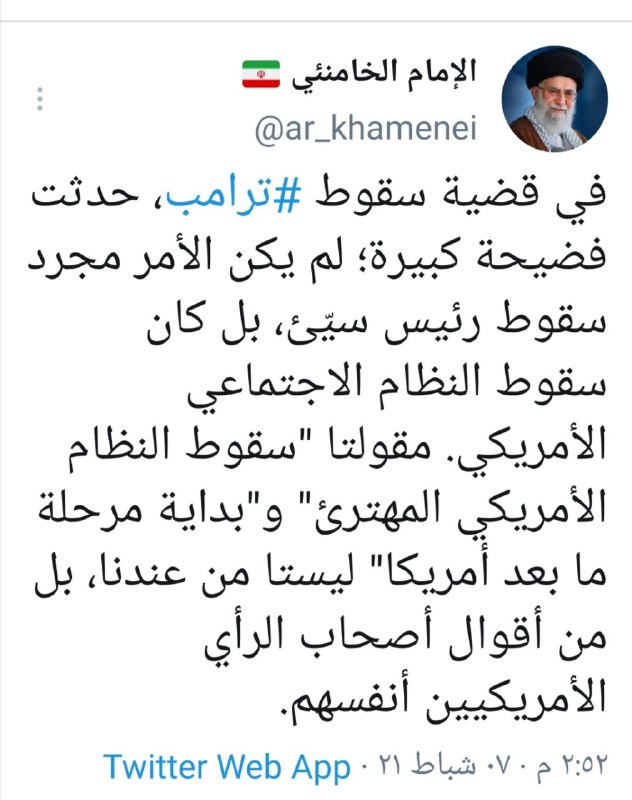 وفي موضوع سقوط وخسارة الرئيس الامريكي الاسبق دونالد ترامب فقد اكد سماحة السيد الخامنئي ان في قضية سقوط ترامب حدثت فضيحة كبرى حيث لم يكن الامر مجرد سقوط رئيس سيئ بل كان سقوط النظام الامريكي المهتريء