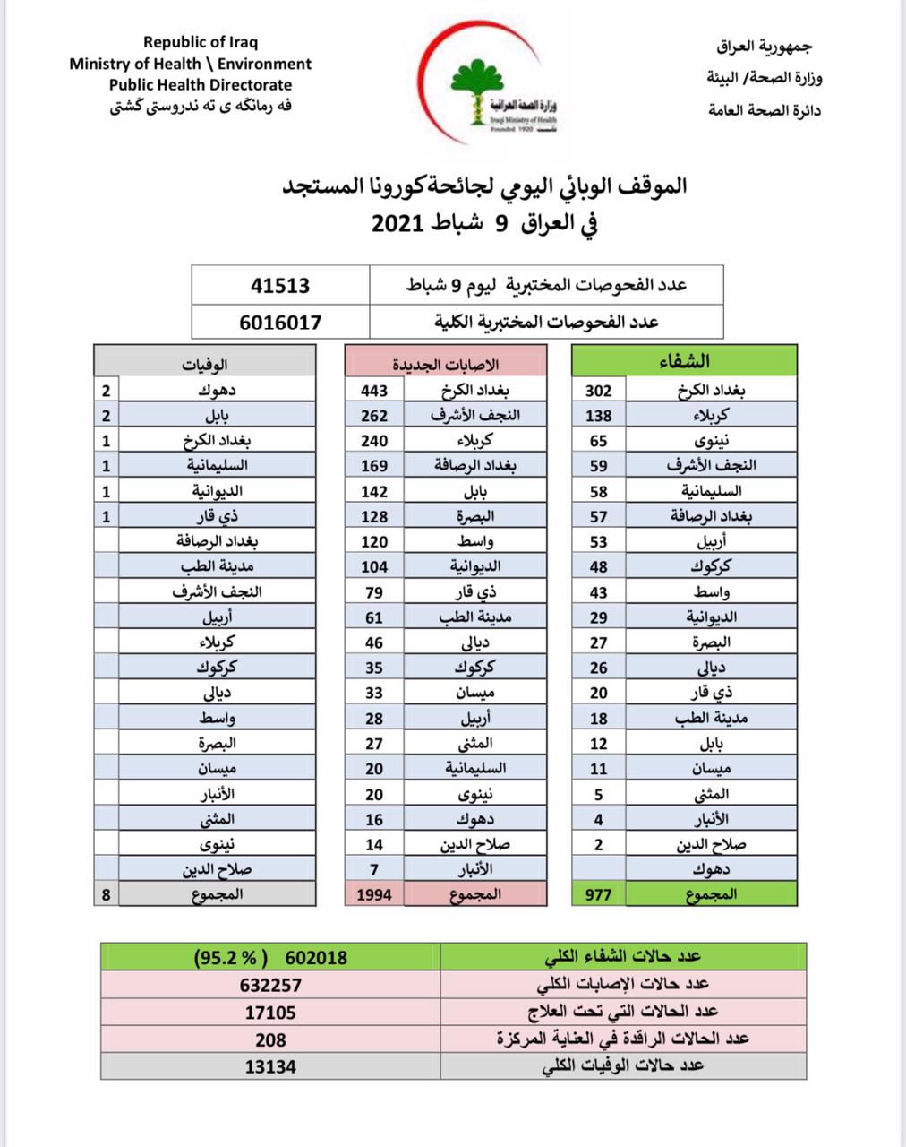 أعلنت وزارة الصحة والبيئة، اليوم الثلاثاء، الموقف الوبائي لفيروس كورونا في عموم البلاد.