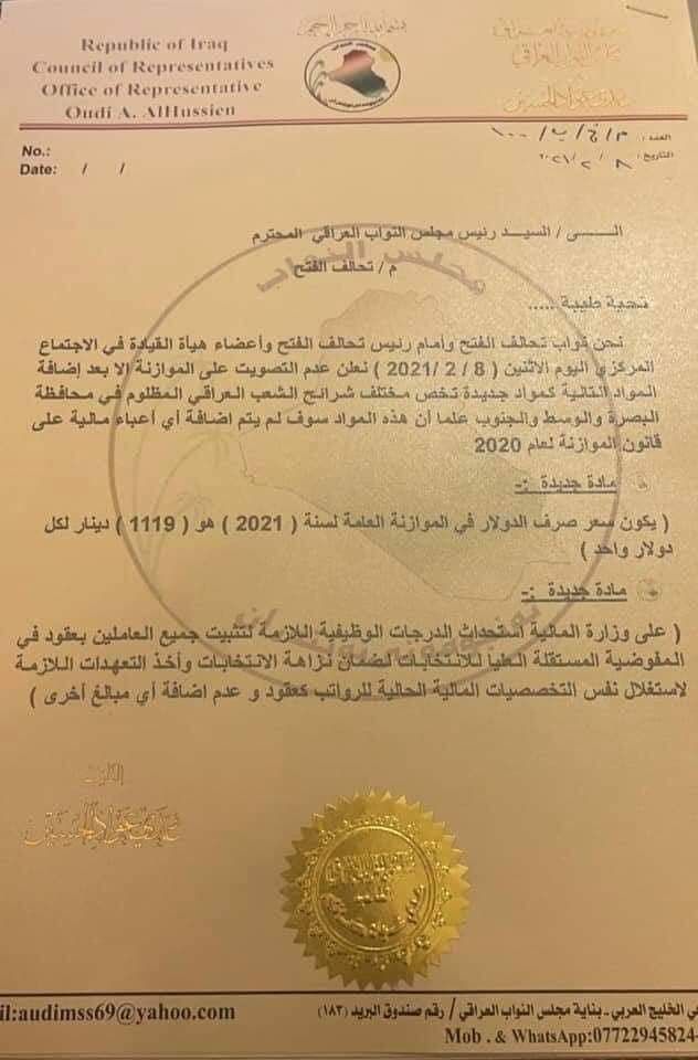 وبحسب الوثيقة، قال التحالف: "نحن نواب تحالف الفتح امام رئيس تحالف الفتح واعضاء هيأة القيادة في الاجتماع المركزي، نعلن عدم التصويت على الموازنة الا بعد اضافة المواد التالية كمواد جديدة تخص مختلف شرائح الشعب العراقي المظلوم في محافظة البصرة والوسط والجنوب، علما ان هذه المواد سوف لم يتم اضافة أي اعباء مالية على قانون الموازنة لعام 2020".