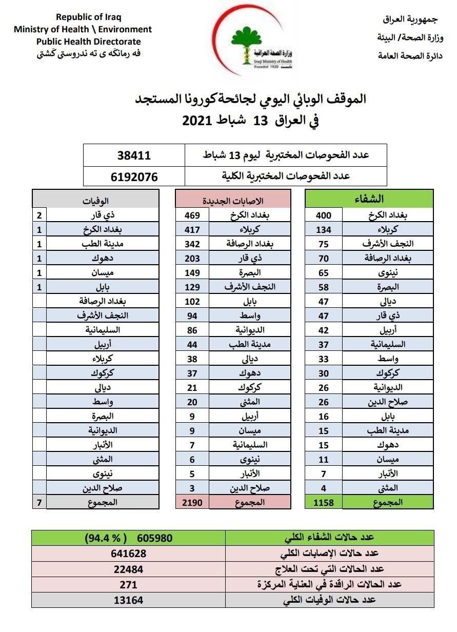 اعلنت وزارة الصحة، اليوم السبت، الموقف الوبائي اليومي في عموم العراق، مؤكدة تسجيل 2190 اصابة جديدة و1158 حالة شفاء فضلاً عن 7 وفيات.