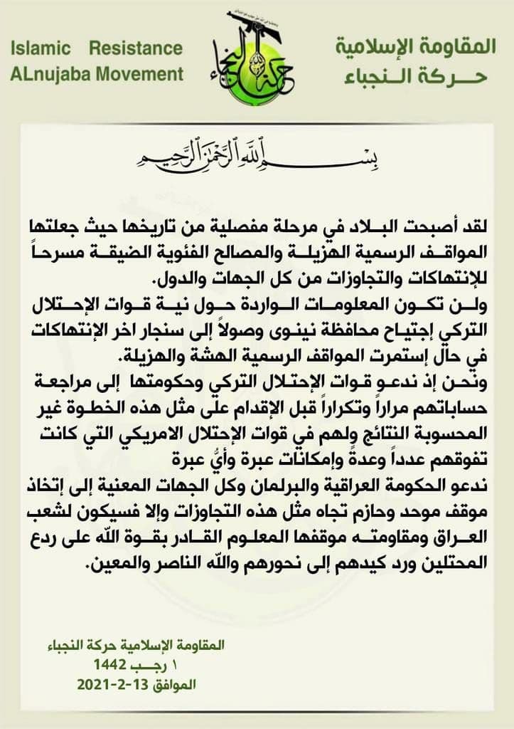 هددت حركة النجباء ، السبت، قوات “الاحتلال التركية” باتخاذ موقف حازم اذا استمرت بانتهاكاتها الاراضي العراقية ، فيما دعت الحكومة العراقية والبرلمان الى اتخاذ موقف حازم تجاه تلك التجاوزات.