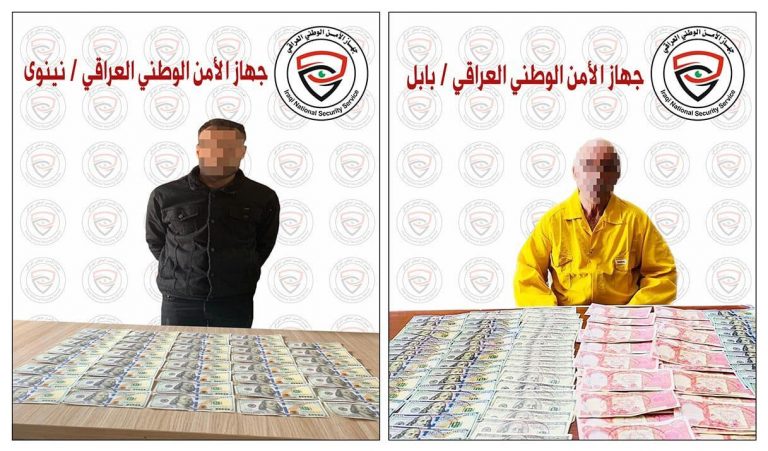 وذكر بيان للجهاز، أنه "بناء على ورودِ معلوماتٍ إستخبارية تفيد بوجود اشخاص يتاجرون بالعملة المزيفة في المحافظات نينوى وبابل شرعت مفارز جهاز الامن الوطني بالتعقبٍ والبحث عن المتهمين وتمكنت من القاء القبض على احد التجار المزيفين للعملة متلبساً في مدينة الحلة وضبطت بحوزته( 7200$ فئة 100$ ، 1مليون عراقي فئة 25000 الف دينار) عملة مزيفة".