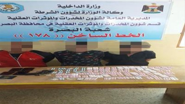 المديرية قالت في بيان ان "مفارز قسم مكافحة مخدرات البصرة تمكنت من إلقاء القبض على (3) متهمين بحوزتهم (1030) حبة مخدرة من مختلف الأنواع، ونصف غرام من مادة الكريستال المخدرة، وأنبوب زجاجي مهشم، ومسدس ناري عيار 9 ملم".