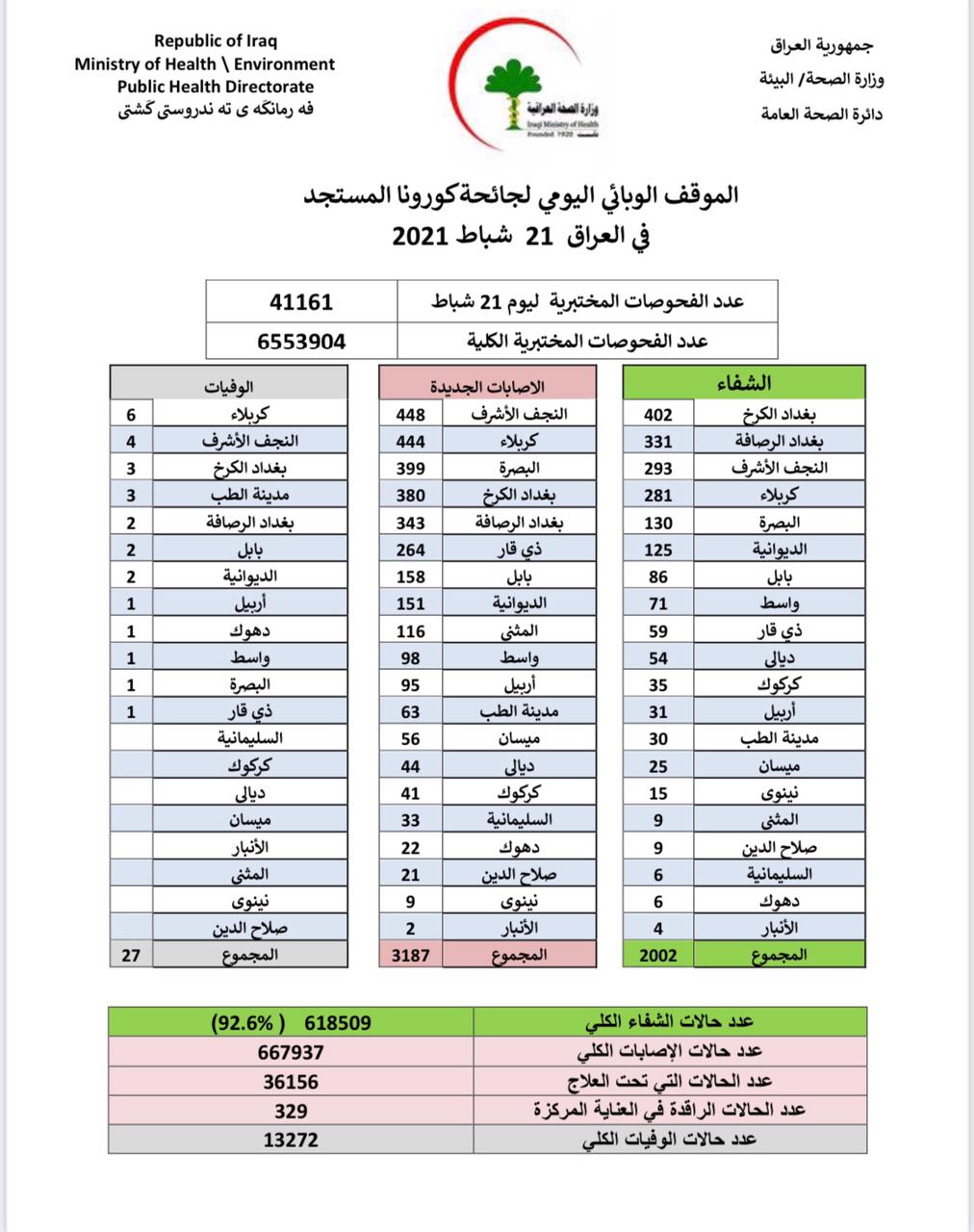 اعلنت وزارة الصحة، الاحد، عن تسجيل 3187 إصابة جديدة بفيروس كورونا، مؤكدة تماثل 2002 حالة للشفاء من كورونا.
