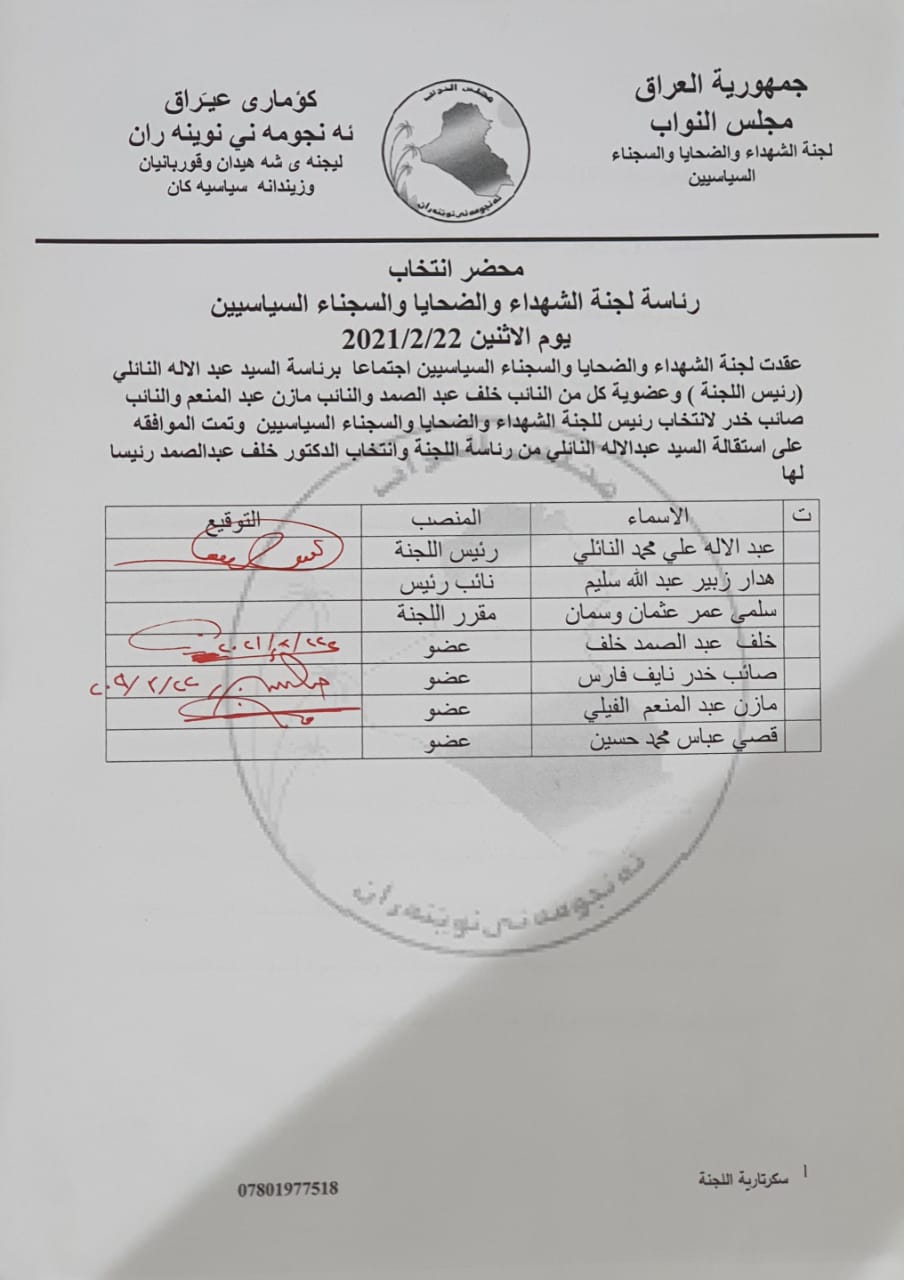 وقالت المكتب الإعلامي للجنة، أن "لجنة الشهداء والضحايا والسجناء السياسيين عقدت اليوم الاثنين 22/2/2021 اجتماعا لانتخاب رئيس للجنة بعد ان قدم الرئيس الحالي للجنة استقالته من منصب الرئيس".