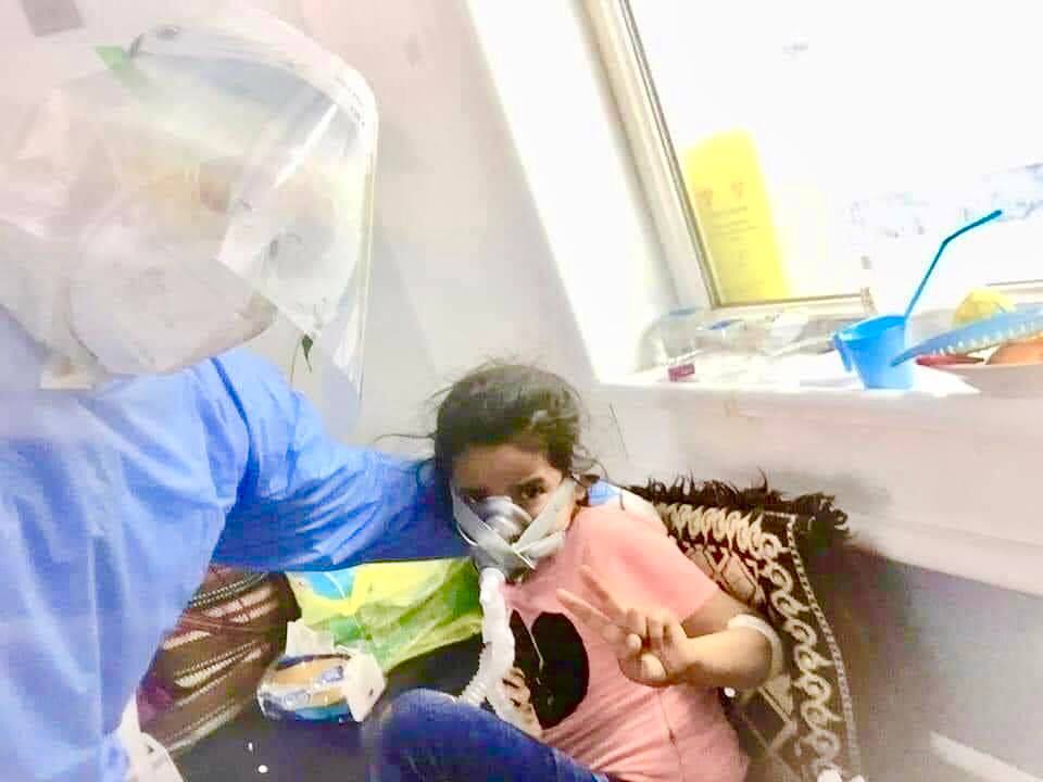 اصغر مصابة بالكورونا في مستشفى الشهيد حسن هلوس الحاتمي بالنجف الأشرف تبتسم وهي على جهاز التنفس الاصطناعي وتلوح بعلامة النصر ..ادعو لها بالشفاء العاجل.
