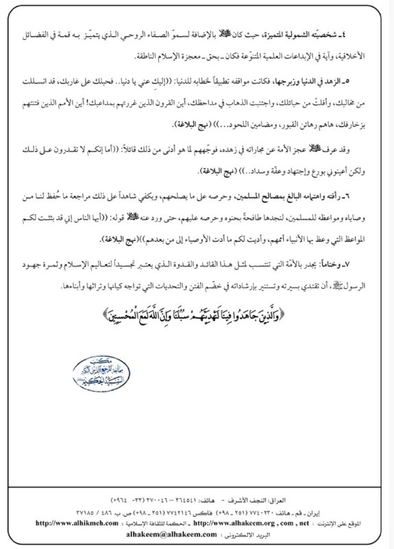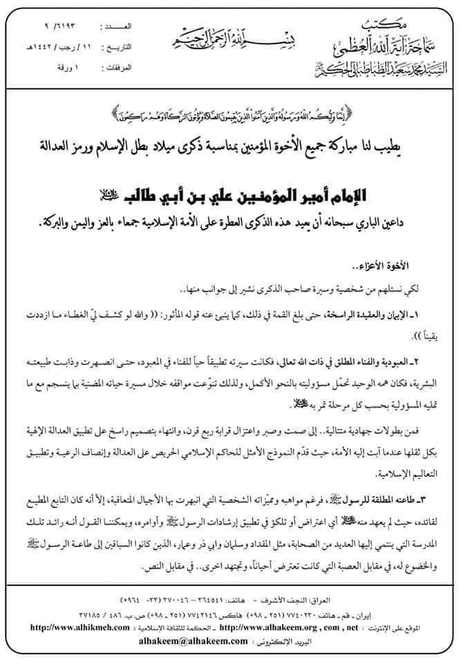 المرجع المفدى السيد محمد سعيد الحكيم يصدر بيانا بمناسبة ولادة امير المؤمنين الامام علي بن ابي طالب عليه السلام