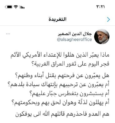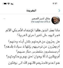وتسائل سماحته في تغريدة نشرها في صفحته الشخصية على تويتر ماذا يعبّر الذين هللوا للإعتداء الأمريكي الآثم فجر اليوم على ثغور العراق الغربية؟ هل يعبّرون عن فرحتهم بقتل أبناء وطنهم؟