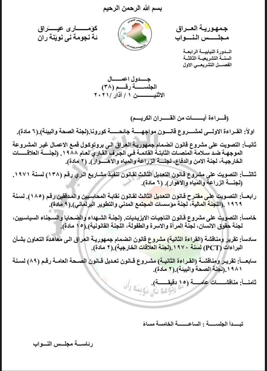 أعلن مجلس النواب، الجمعة، جدول اعمال الجلسة الـ38، المقرر عقدها يوم الاثنين المقبل. ونشرت الدائرة الإعلامية للبرلمان جدول اعمال الجلسة المقبلة، حيث تضمنت "القراءة الأولى لمشروع قانون مواجهة جائحة كورونا، والتصويت على مشروع قانون انضمام جمهورية العراق إلى بروتوكول قمع الأعمال غير المشروعة، التصويت على مشروع قانون التعديل الثالث لقانون تنفيذ مشاريع الرأي، بالإضافة إلى التصويت على مقترح قانون التعديل الثالث لقانون نقابة المحاسبين والمدققين".