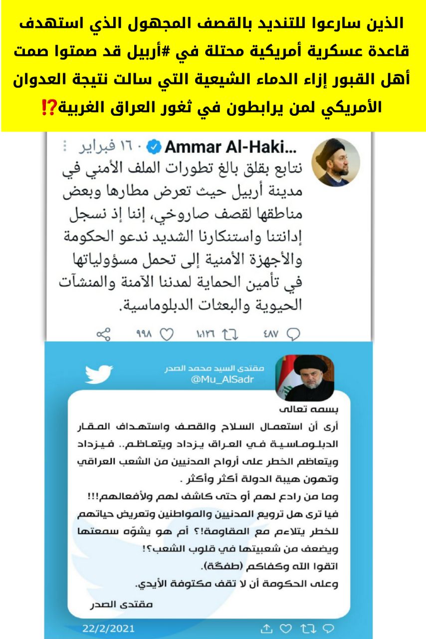 الذين سارعوا للتنديد بالقصف المجهول للقاعدة الامريكية في اربيل صمتوا صمت القبور ازاء الدماء الشيعية التي سالت في ثغور العراق الغربية