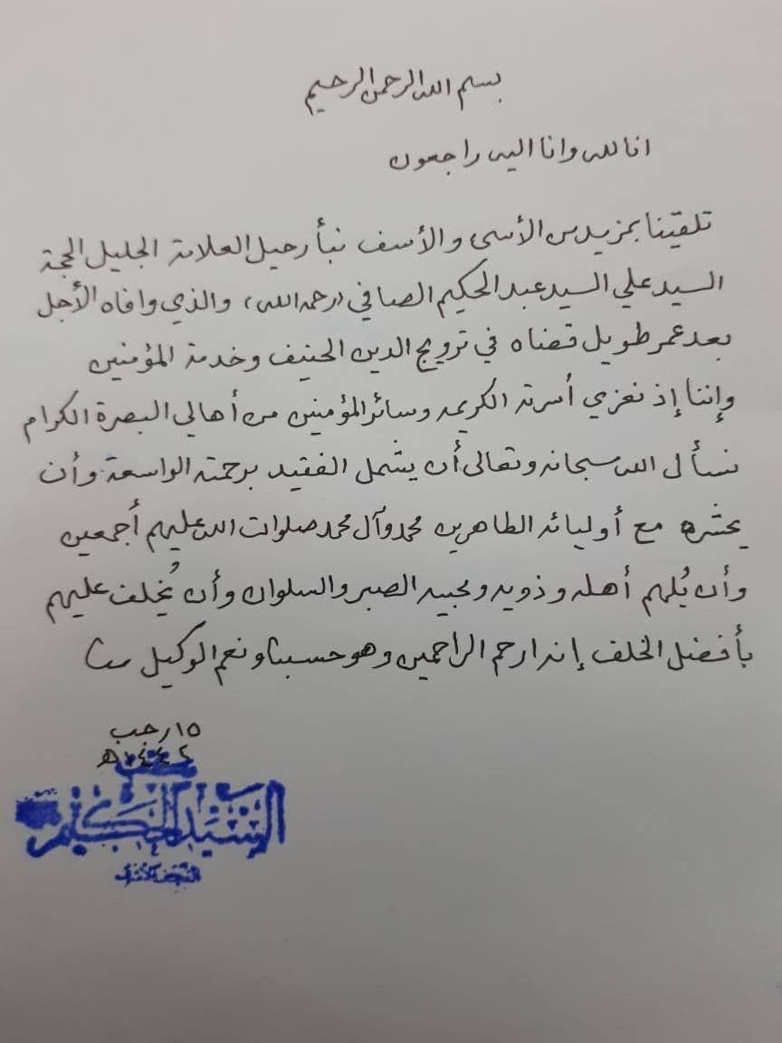 سماحة المرجع الديني الكبير السيد مُحمد سَعيد الحكيم ( دام ظله ) يعزي بوفاة العلامة السيد علي عبد الحكيم الصافي ( رحمه الله).