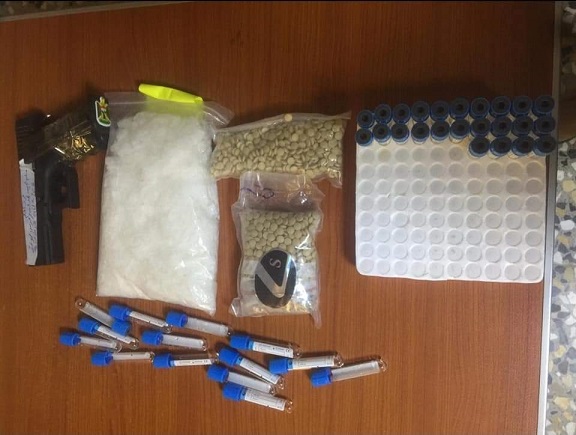 والمتهم (م . ح . ج ) البالغ من العمر 35 عاما وضبط داخل منزله كيس يزن ( 530 غرام ) من مادة الكريستال المخدرة و (1710 ) قرص مخدر من النوع المعروف محليا بالكبتي و ( 38 ) انبولة تعاطي ومسدس صوتي مع 2 مخازن عتاد من نوعه .