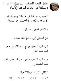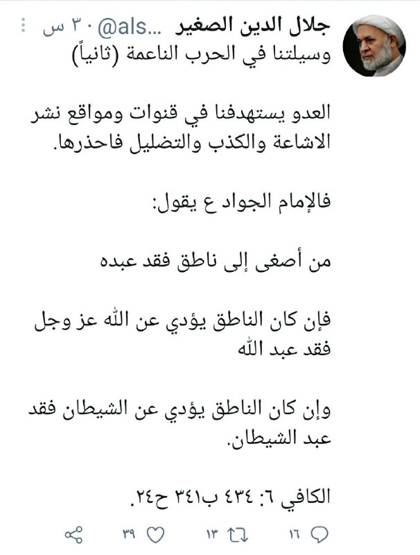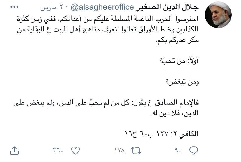 وقال سماحته في تغريدة له على تويتر (( احترسوا الحرب الناعمة المسلطة عليكم من اعدائكم ففي زمن كثرة الكذّابين وخلط الأوراق تعالوا لنعرف مناهج أهل البيت ع للوقاية من مكر عدوكم بكم.