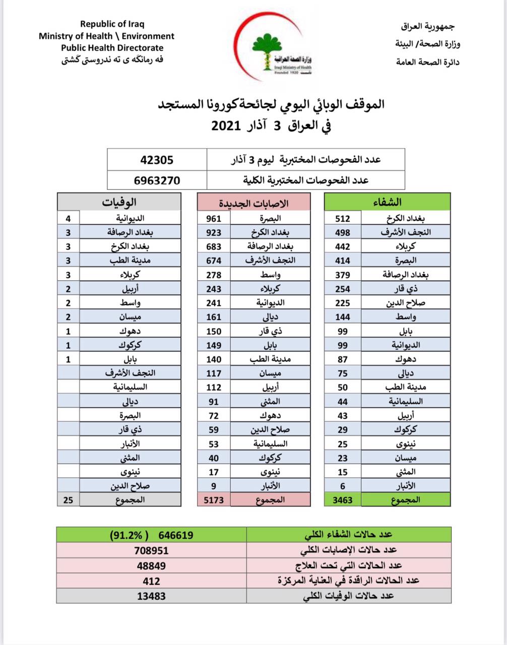 أعلنت وزارة الصحة، اليوم الأربعاء، الموقف الوبائي الخاص بجائحة كورونا في عموم العراق.