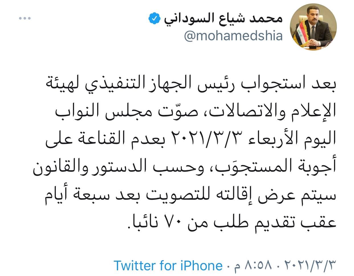 السوداني: رئيس هيئة الاعلام والاتصالات سيقال من منصبه بعد 7 ايام