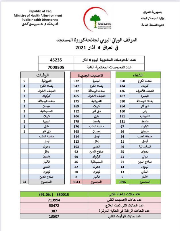أعلنت وزارة الصحة، اليوم الخميس، الموقف الوبائي الخاص بجائحة كورونا في عموم العراق.