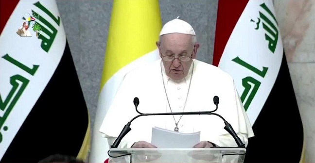 قال البابا فرنسيس بابا الفتيكان في خطاب له في كنيسة سيدة النجاة ببغداد انه ممتن لفرصة المجيء الى العراق مهد الحضارات واضاف اشكر الله على لقائنا اليوم
