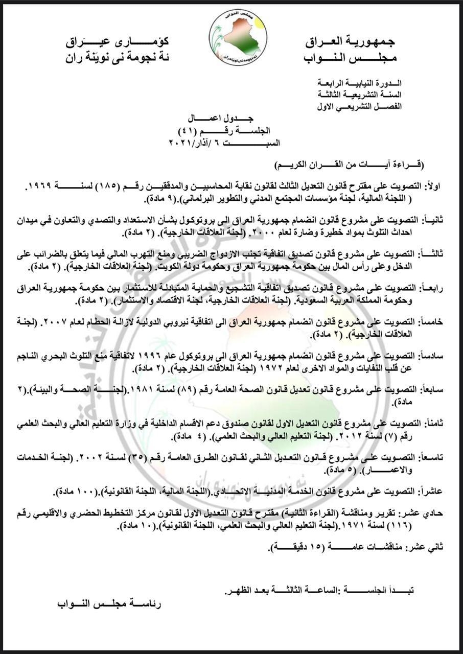 نشرت الدائرة الإعلامية لمجلس النواب، جدول أعمال الجلسة رقم 41 والتي من المقرر أن تُعقد غداً السبت، ويتضمن الجدول 11 فقرة ليس من بينها استكمال التصويت على قانون المحكمة الاتحادية، والتصويت على قانون الموازنة.
