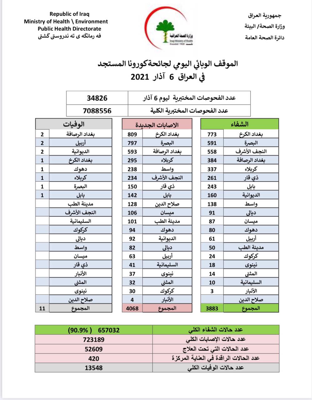 أعلنت وزارة الصحة، اليوم السبت، الموقف الوبائي الخاص بجائحة كورونا في عموم العراق.