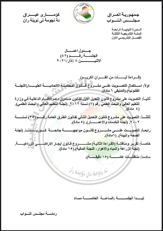جدول أعمال جلسة البرلمان ليوم الاثنين المقبل.