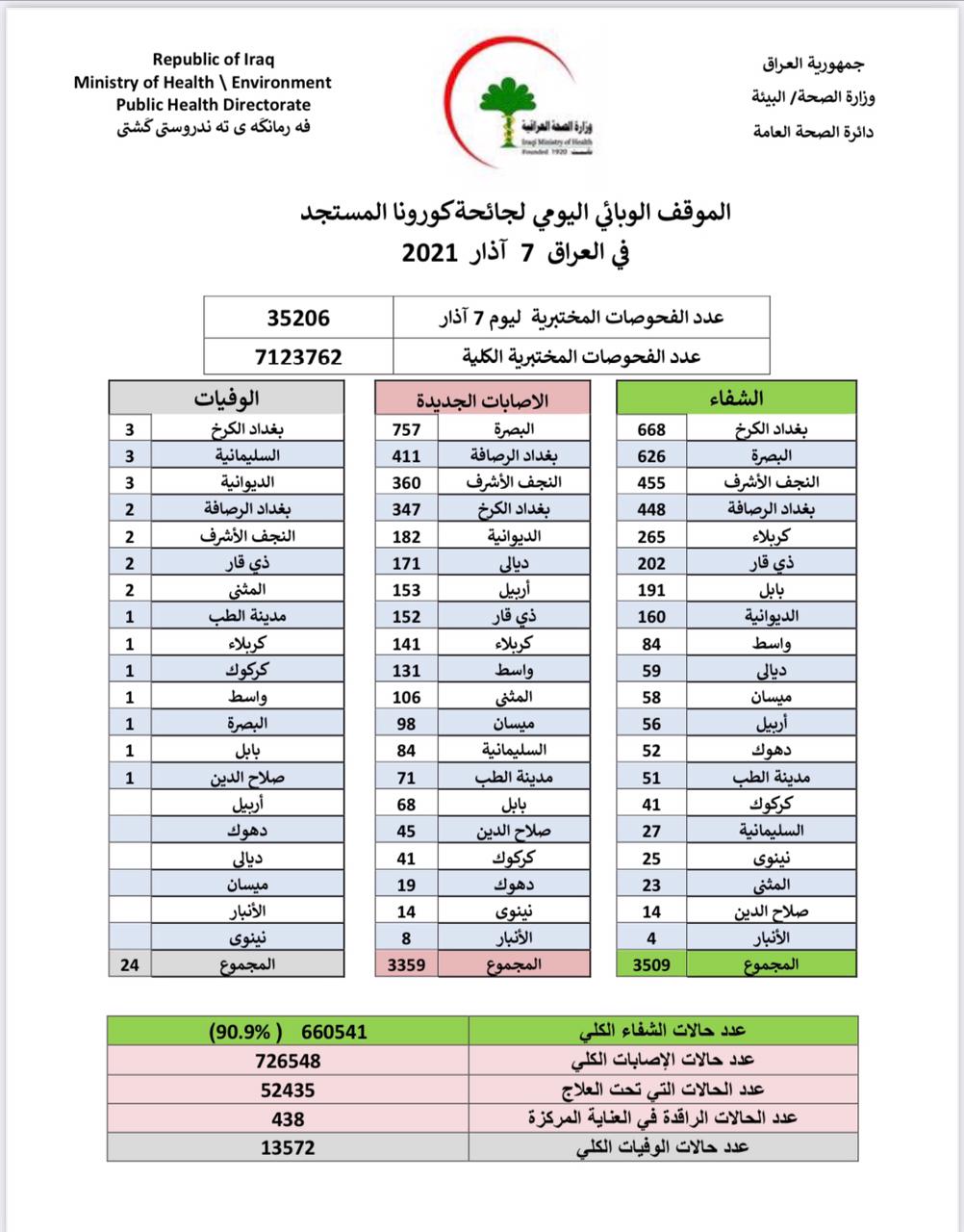 وقالت الوزارة في بيان ، إنها "سجلت 3359 إصابة جديدة، و 3509 حالة شفاء، و 24 حالة وفاة جراء الفيروس في عموم البلاد".