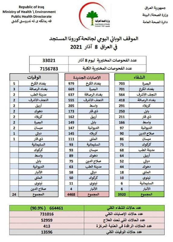 أعلنت وزارة الصحة، اليوم الاثنين، الموقف الوبائي الخاص بجائحة كورونا في عموم العراق.
