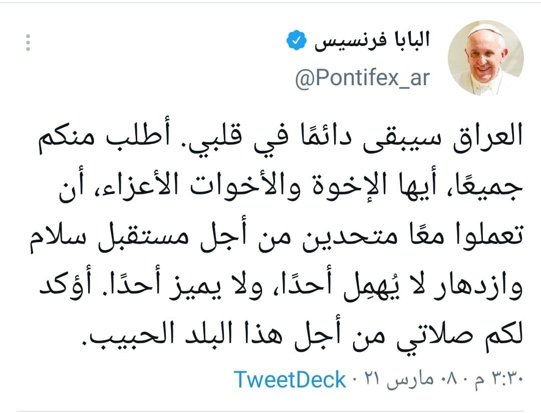 تغريدة جديدة للبابا فرنسيس بعد وصوله الفاتيكان : العراق سيبقى دائما في قلبي .. صلاتي من أجل هذا البلد الحبيب