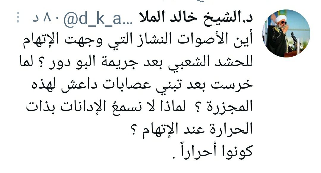 الشيخ خالد الملا مغردا ردا على الاصوات النشاز التي اتهمت الحشد الشعبي بارتكاب جريمة البو دور