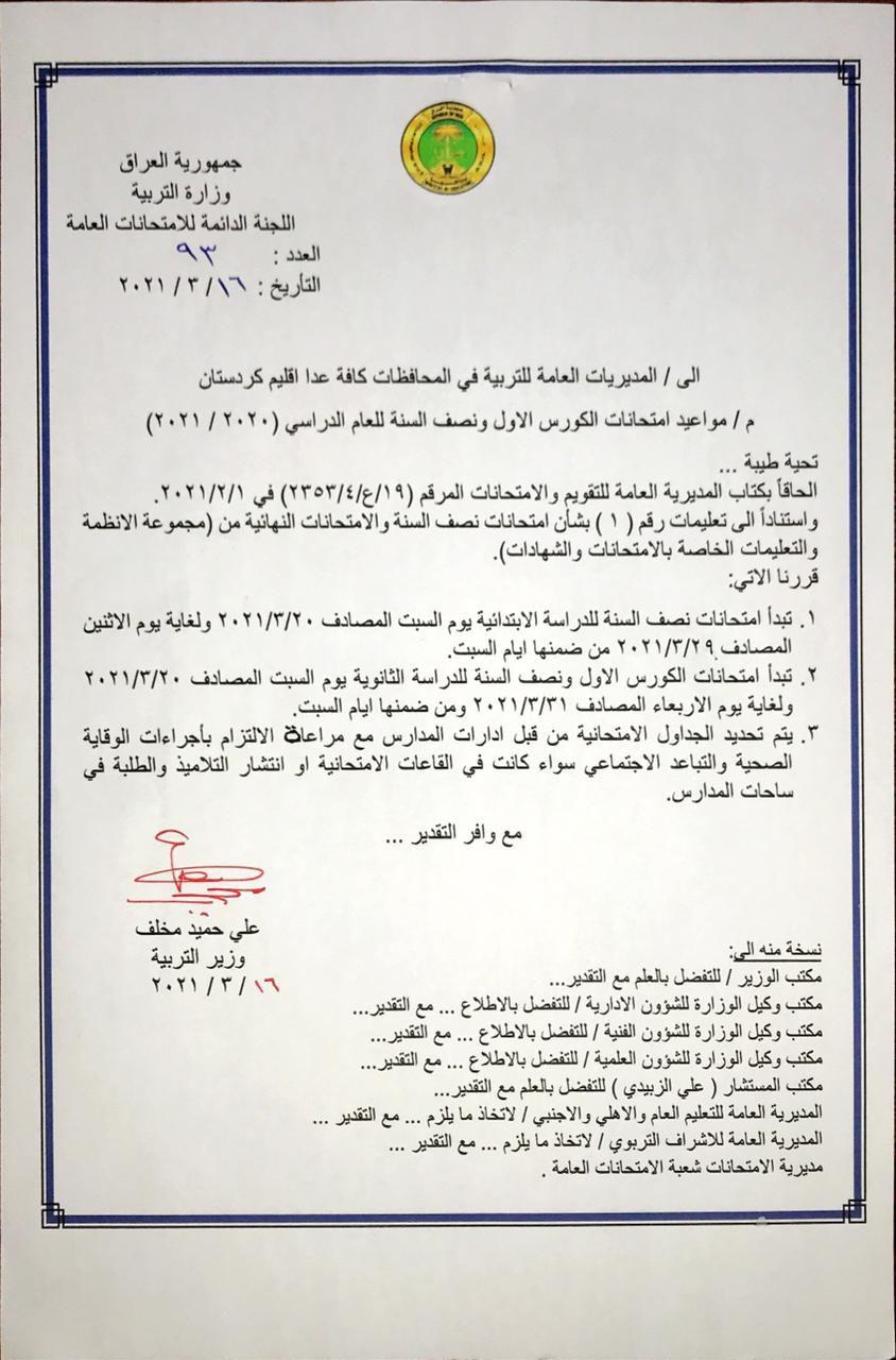 وقالت الوزارة في بيان ، إنها "استحصلت الموافقات الرسمية لانطلاق امتحانات نصف السنة ونهاية الكورس الاول للدراسة الابتدائية والثانوية".