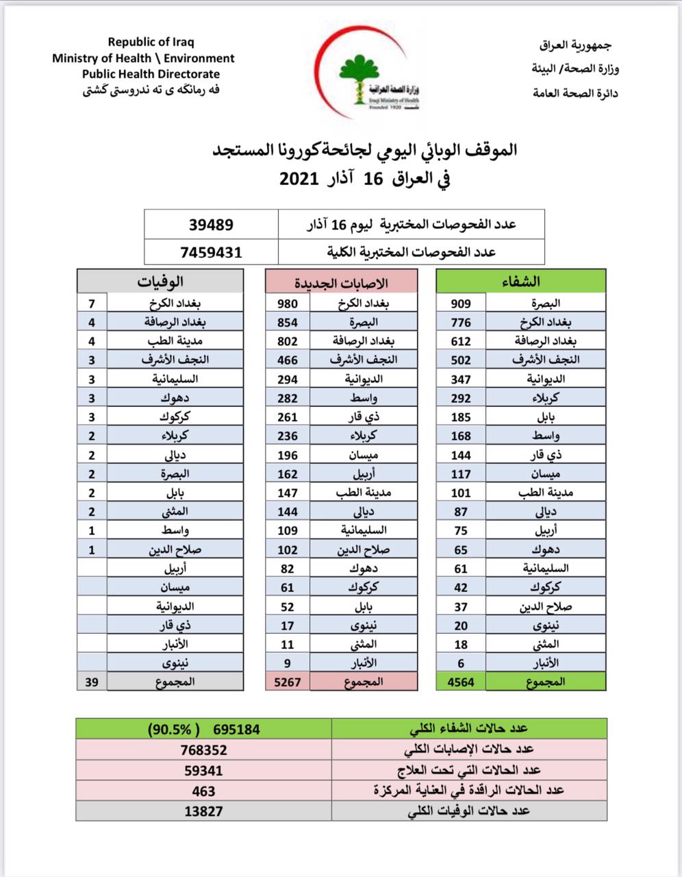 وقالت الوزارة في بيان إنها "سجلت 5267 إصابة جديدة، مقابل 4564 حالة شفاء، و 39 حالة وفاة جديدة بكورونا في عموم البلاد".